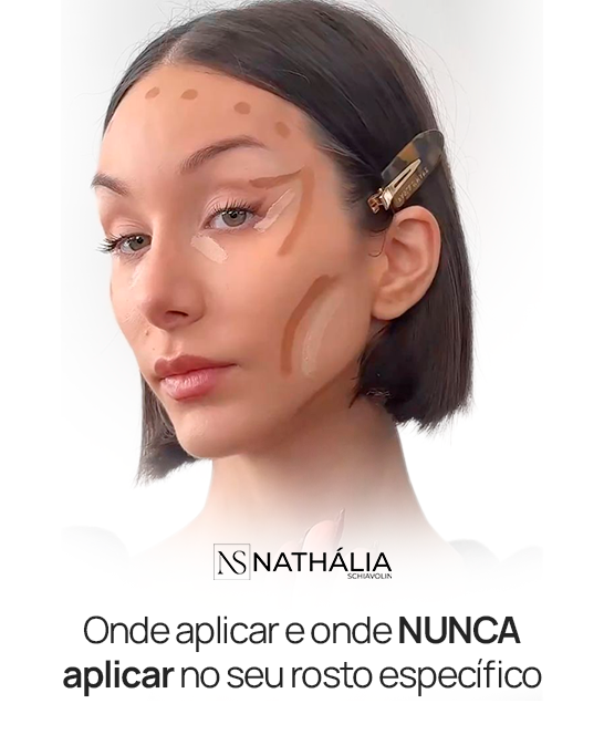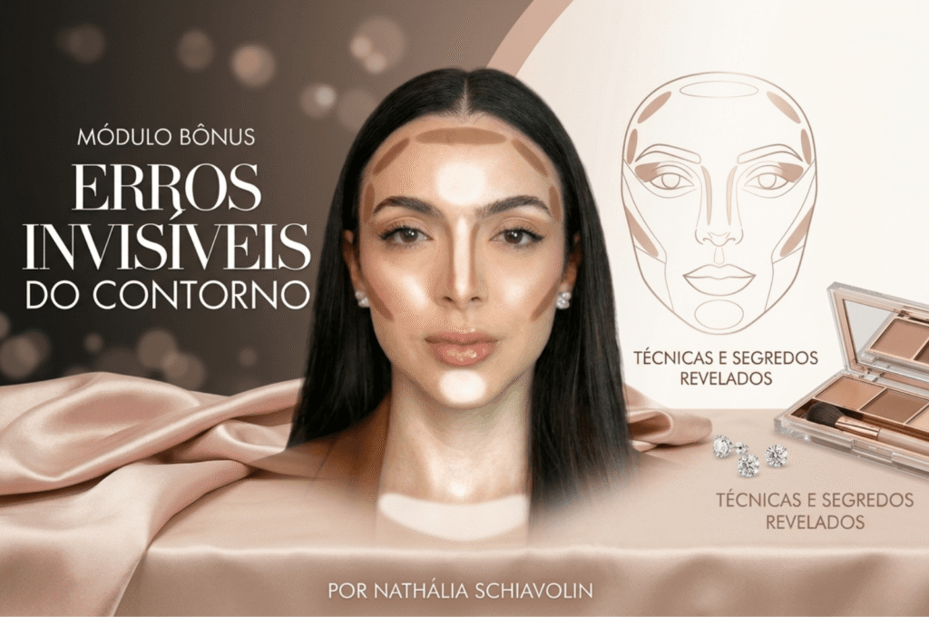 É o guia completo que ensina a técnica profissional de contorno facial adaptada para você aplicar em casa.